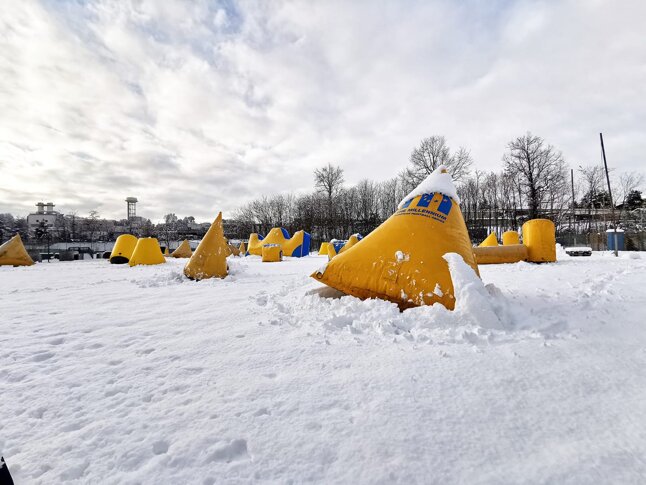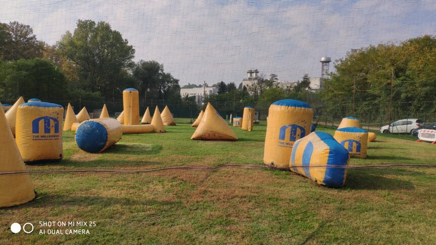 L’area di gioco nello “”speed ball” è molto variabile, Il nostro campo è classificato come M7 (Men 7) ciò significa che è concepito per giocare dei game fino a 7 giocatori contro 7 , al suo interno si trovano 44 gonfiabili strutturato come quelli europei Millenium.